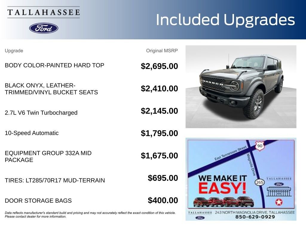 The Bronco Badlands also boasts a host of advanced features to enhance your driving experience, such as Dual-Zone Electronic Automatic Temperature Control, Power Outlet - Back Side of Center Floor Console, 2-Door Intelligent Access with Lock/Unlock, BLIS Blind Spot Information System, and Rear Parking Sensors. Staying connected is a breeze with the Bronco's Connected Navigation and Dual Smart Charging USB Ports.