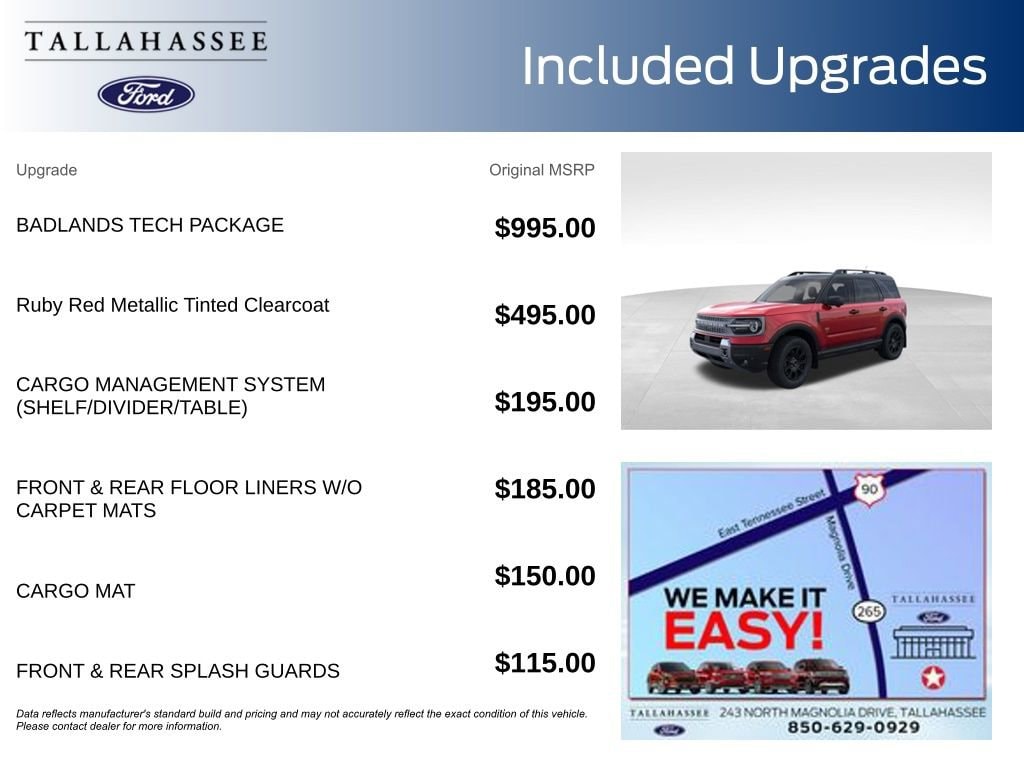Ruby Red Metallic Tinted Clearcoat 2025 Ford Bronco Sport Badlands 4WD 8-Speed Automatic EcoBoost 2.0L I4 GTDi DOHC Turbocharged VCT Price includes: $1000 - Final Days Mega Bonus Cash. Exp. 01/02/2026 $1000 - Open Bonus Cash. Exp. 01/05/2026 $1500 - Retail Bonus Cash. Exp. 01/05/2026