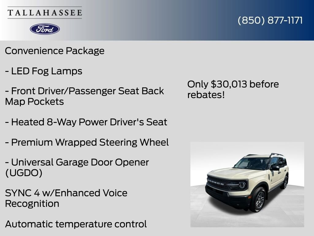 Experience the perfect blend of rugged capability and modern sophistication with the 2025 Ford Bronco Sport Big Bend. This exceptional SUV is ready to elevate your driving experience and take you on unforgettable adventures. Visit our showroom today and discover the Bronco Sport that's tailored to your lifestyle. Price includes: $1000 - Open Bonus Cash. Exp. 11/03/2025 $1000 - Retail Bonus Cash. Exp. 01/05/2026