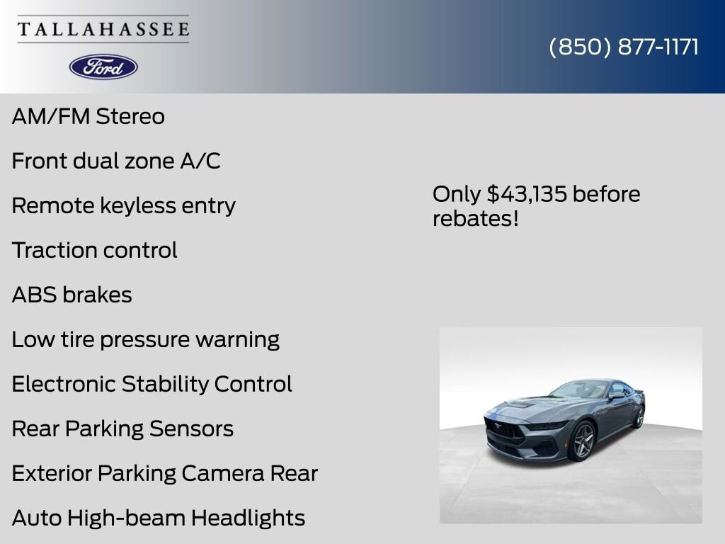 Don't settle for ordinary when you can have the extraordinary. Experience the raw power and unparalleled style of the 2025 Ford Mustang GT. Visit our showroom today and let us help you unlock the true potential of this remarkable sports car. Price includes: $3500 - Retail Customer Cash. Exp. 01/05/2026