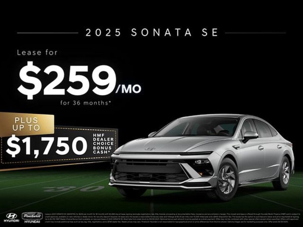 This 2025 Sonata SEL will not last. Hyundai has limited availability across the region, and with increased demand in Moore and neighboring counties, every new arrival draws immediate attention. Now is the time to act. Schedule your test drive today at Pinehurst Hyundai and experience firsthand why smart buyers from across the region are making the switch. The Sonata SEL is turning heads, and when you pair it with the Pinehurst promise of long-term value, attentive care, and award-winning service, theres simply no better decision on the table. Price does include all applicable Factory to Customer/Dealer ; Price does not include Tax, Title, Licence and Dealer Service Fee of $798: $2000 - Hyundai HMF Dealer Choice : $2000 discount and 5.99% APR for 24 months. $44.32 per $1000 financed. Available to well qualified buyers who finance through Hyundai Motor Finance. H704. Exp. 11/03/2025 $400 - College Graduate Program. Exp. 11/03/2025 $500 - First Responders Program. Exp. 11/03/2025 $500 - Military Program. Exp. 11/03/2025