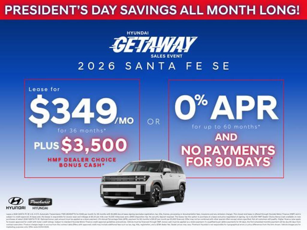 Discover the pinnacle of SUV luxury and performance with the 2026 Hyundai Santa Fe Hybrid Calligraphy. Experience the exceptional craftsmanship, cutting-edge technology, and unparalleled driving dynamics that make this vehicle a true standout in its class. Visit our showroom today to schedule a test drive and explore the endless possibilities of this remarkable SUV. Price does include all applicable Factory to Customer/Dealer ; Price does not include Tax, Title, Licence and Dealer Service Fee of $798: $4000 - Hyundai HMF Dealer Choice : $4000 discount and 5.39% APR for 24 months. $44.05 per $1000 financed. Available to well qualified buyers who finance through Hyundai Motor Finance. H704. Exp. 03/02/2026