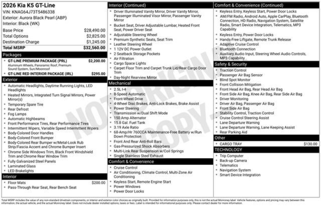 Aurora Black Pearl 2026 Kia K5 GT-Line I4 8-Speed Automatic FWD Price includes: $1250 - KFA Dealer Choice Program: $1250 discount and 5.25% APR for 36 months. $30.08 per $1000 financed. Available to well qualified buyers who finance through Kia Finance America. 506. Exp. 05/04/2026