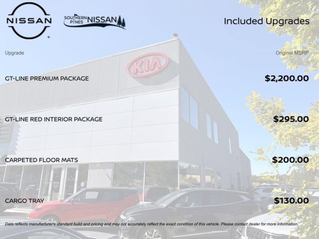 18 Alloy wheels, 4-Wheel Disc Brakes, 6 Speakers, ABS brakes, Active Sound Design, Air Conditioning, AM/FM radio: SiriusXM, Auto High-beam Headlights, Automatic temperature control, Bose Premium Audio, Brake assist, Bumpers: body-color, Cargo Tray, Carpeted Floor Mats, Delay-off headlights, Driver door bin, Driver vanity mirror, Dual front impact airbags, Dual front side impact airbags, Electronic Stability Control, Emergency communication system: Kia Connect (includes 1 year free trial), Four wheel independent suspension, Front anti-roll bar, Front Bucket Seats, Front Center Armrest, Front dual zone A/C, Front fog lights, Front reading lights, Fully automatic headlights, GT-Line Premium Package, GT-Line Red Interior Package, Heated door mirrors, Heated Front Bucket Seats, Heated front seats, Illuminated entry, Knee airbag, Leather Shift Knob, Leather steering wheel, LED Interior Lighting, Low tire pressure warning, Navigation System, Occupant sensing airbag, Outside temperature display, Overhead airbag, Overhead console, Panic alarm, Panoramic Sunroof, Passenger door bin, Passenger vanity mirror, Power door mirrors, Power driver seat, Power steering, Power windows, Radio data system, Radio: AM/FM Audio System, Rear anti-roll bar, Rear seat center armrest, Rear side impact airbag, Rear window defroster, Remote keyless entry, Security system, Speed control, Speed-sensing steering, Split folding rear seat, Sport steering wheel, Steering wheel mounted audio controls, SynTex Seat Trim, Tachometer, Telescoping steering wheel, Tilt steering wheel, Traction control, Trip computer, Turn signal indicator mirrors, Variably intermittent wipers, Wheels: 18 x 7.5J Gloss Black Machined Finish Alloy, Wheels: 18 x 7.5J Unique Gloss Black Alloy.