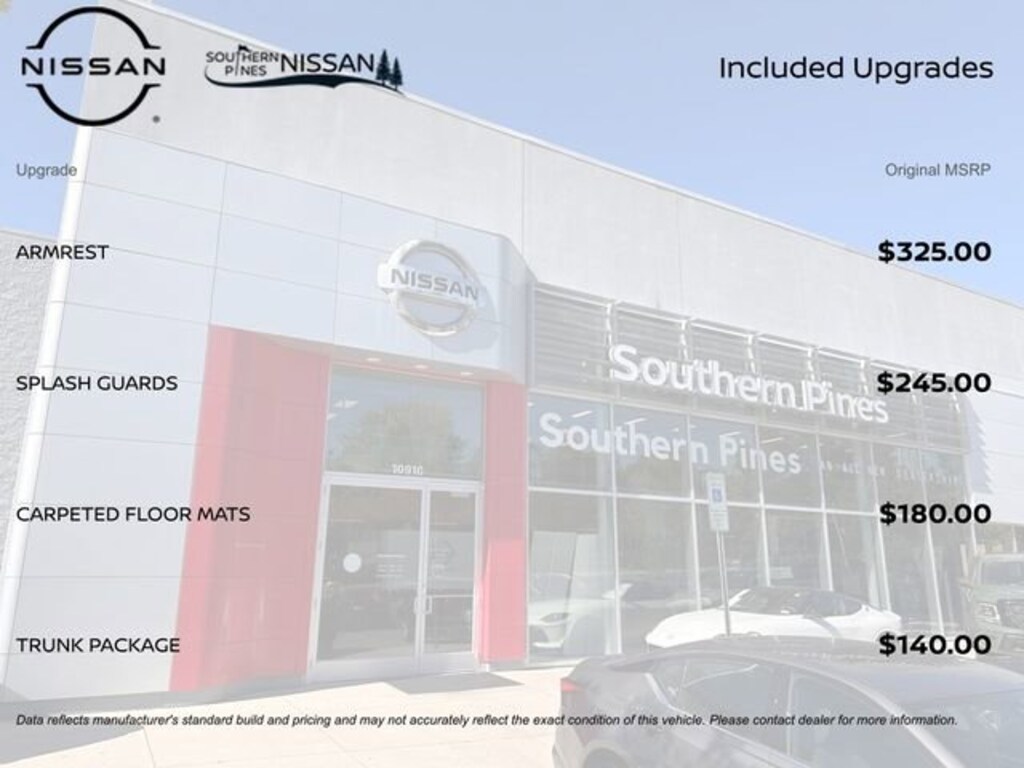 Southern Pines Nissan is a family-owned dealership that has been serving the community for over 50 years. We offer a wide selection of new and used cars, SUVs, and trucks, as well as financing and leasing options. Visit us today to see why buying a car from us is worth it! ValueShield is a simple and affordable way to protect your vehicle's value from diminished value. Get up to $10,000 when you trade in or sell your vehicle, even if it's been in an accident. Price includes: $750 - Nissan Conditional Offer - Q2 Service to Sales New Vehicle Offer. Exp. 09/30/2025