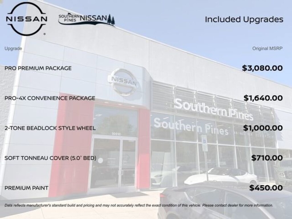 4WD, 17 Painted Alloy Wheels, 18 Alloy wheels, 2-Tone Beadlock Style Wheel, 3.692 Axle Ratio, 4-Wheel Disc Brakes, 6 Speakers, ABS brakes, Air Conditioning, All Season Floor Mats with PRO-4X Logo, AM/FM radio: SiriusXM, Anti-whiplash front head restraints, Auto High-beam Headlights, Auto-Dimming Mirror, Auto-Tilt and Slide Sunroof with Manual Shade, Automatic temperature control, Black Accent Package, Blind Spot Warning, Brake assist, Bumpers: body-color, Delay-off headlights, Driver door bin, Driver vanity mirror, Dual front impact airbags, Dual front side impact airbags, Electronic Stability Control, Electronic Tailgate Lock, Emergency communication system, Essentials Kit, Fender Premium Audio System with 10 Speakers, Front anti-roll bar, Front Bucket Seats, Front Center Armrest, Front dual zone A/C, Front fog lights, Front reading lights, Front wheel independent suspension, Fully automatic headlights, Grille Accent Lighting, Heated Front Bucket Seats, Heated front seats, Heated Steering Wheel, Heated steering wheel, HomeLink UGDO, Illuminated entry, Intelligent Around View Monitor (I-AVM), Knee airbag, Leather Seat Trim, Leather steering wheel, Low tire pressure warning, Mud Flaps, Nissan Door-to-Door Navigation, Occupant sensing airbag, Overhead airbag, Overhead console, Panic alarm, Partial Under-Seat Storage Delete, Passenger door bin, Passenger vanity mirror, Power door mirrors, Power driver seat, Power passenger seat, Power steering, Power windows, Premium Paint, PRO Embroidered Premium Cloth Seat Trim, PRO Premium Package, PRO-4X Carpeted Floor Mats, PRO-4X Convenience Package, Radio data system, Radio: SiriusXM/AM/FM/Auxiliary/USB Audio System, Rear anti-roll bar, Rear seat center armrest, Rear side impact airbag, Rear step bumper, Remote keyless entry, Security system, Soft Tonneau Cover (5.0' Bed), Speed control, Speed-sensing steering, Split folding rear seat, Steering wheel mounted audio controls, Tachometer, Telescoping steering wheel, Tilt steering wheel, Tow Package, Traction control, Traffic Sign Recognition (TSR), Trip computer, Variably intermittent wipers, Voltmeter, Wireless Apple CarPlay/Wireless Android Auto, Wireless Charging For Personal Devices, 4WD.