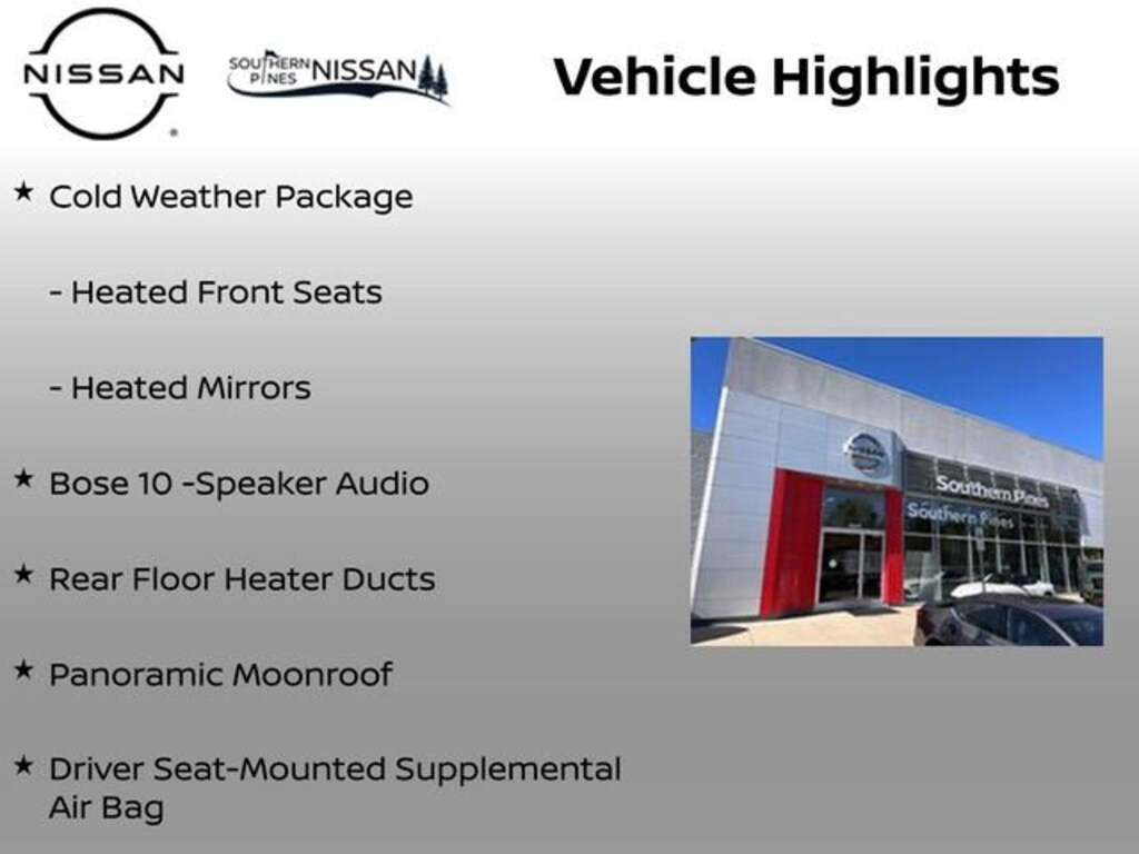 Bose 10 -Speaker Audio, Cold Weather Package, Driver Seat-Mounted Supplemental Air Bag, Heated Front Seats, Heated Mirrors, Heated Steering Wheel, Panoramic Moonroof, Rear Floor Heater Ducts, SR Premium Package, 17 Alloy Wheels, 18 Alloy wheels, 19 Alloy Wheels, 4-Wheel Disc Brakes, 6 Speakers, ABS brakes, Air Conditioning, AM/FM radio, Auto High-beam Headlights, Automatic temperature control, Brake assist, Bumpers: body-color, Carpeted Floor Mats & Underfloor Protector, Delay-off headlights, Driver door bin, Driver vanity mirror, Dual front impact airbags, Dual front side impact airbags, Electronic Stability Control, Emergency communication system: NissanConnect Services, Exterior Parking Camera Rear, Front anti-roll bar, Front Bucket Seats, Front Center Armrest, Front reading lights, Front wheel independent suspension, Fully automatic headlights, Garage door transmitter: myQ Connected Garage, Illuminated entry, Knee airbag, Leather Shift Knob, Leather steering wheel, Low tire pressure warning, NissanConnect featuring Apple CarPlay and Android Auto, Occupant sensing airbag, Outside temperature display, Overhead airbag, Overhead console, Panic alarm, Passenger door bin, Passenger vanity mirror, Power door mirrors, Power steering, Power windows, Premium Paint, Radio data system, Radio: AM/FM/SiriusXM Audio System, Rear anti-roll bar, Rear reading lights, Rear seat center armrest, Rear side impact airbag, Rear window defroster, Rear window wiper, Remote keyless entry, Security system, Speed control, Speed-sensing steering, Splash Guards, Split folding rear seat, Spoiler, Sport Leatherette w/Cloth Insert Seat Trim, Sport steering wheel, Steering wheel mounted audio controls, Tachometer, Telescoping steering wheel, Tilt steering wheel, Traction control, Trip computer, Turn signal indicator mirrors, Variably intermittent wipers, Bose 10 -Speaker Audio, Cold Weather Package, Driver Seat-Mounted Supplemental Air Bag, Heated Front Seats, Heated Mirrors, Heated Steering Wheel, Panoramic Moonroof, Rear Floor Heater Ducts, SR Premium Package.