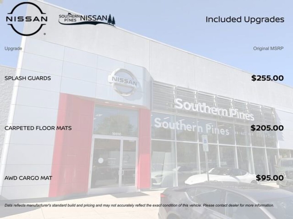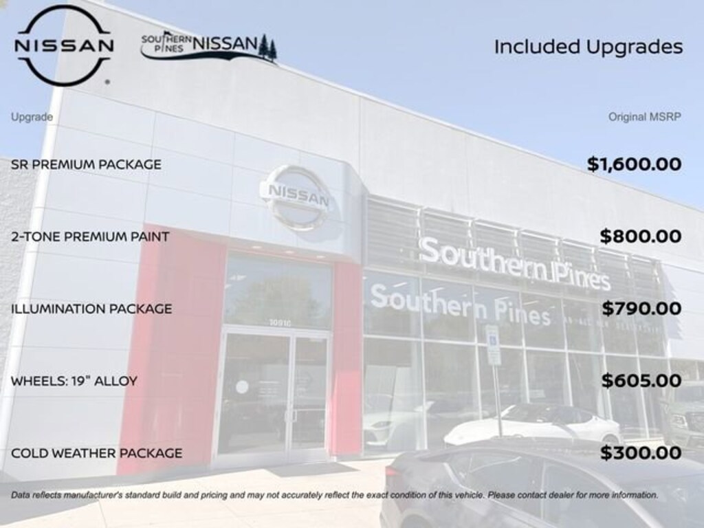 17 Alloy Wheels, 18 Alloy wheels, 19 Alloy Wheels, 2-Tone Premium Paint, 4-Wheel Disc Brakes, 6 Speakers, ABS brakes, Air Conditioning, AM/FM radio, Auto High-beam Headlights, Automatic temperature control, AWD Cargo Mat, Bose 10 -Speaker Audio, Brake assist, Bumpers: body-color, Carpeted Floor Mats, Cold Weather Package, Delay-off headlights, Driver door bin, Driver Seat-Mounted Supplemental Air Bag, Driver vanity mirror, Dual front impact airbags, Dual front side impact airbags, Electronic Stability Control, Emergency communication system: NissanConnect Services, Exterior Parking Camera Rear, Four wheel independent suspension, Front anti-roll bar, Front Bucket Seats, Front Center Armrest, Front reading lights, Fully automatic headlights, Garage door transmitter: myQ Connected Garage, Heated Front Seats, Heated Mirrors, Heated Steering Wheel, Illuminated Cargo Scuff Plate, Illuminated entry, Illuminated Kickplates, Illumination Package, Knee airbag, Leather Shift Knob, Leather steering wheel, Low tire pressure warning, NissanConnect featuring Apple CarPlay and Android Auto, Occupant sensing airbag, Outside temperature display, Overhead airbag, Overhead console, Panic alarm, Panoramic Moonroof, Passenger door bin, Passenger vanity mirror, Power door mirrors, Power steering, Power windows, Radio data system, Radio: AM/FM/SiriusXM Audio System, Rear anti-roll bar, Rear Floor Heater Ducts, Rear reading lights, Rear seat center armrest, Rear side impact airbag, Rear window defroster, Rear window wiper, Remote keyless entry, Security system, Speed control, Speed-sensing steering, Splash Guards, Split folding rear seat, Spoiler, Sport Leatherette w/Cloth Insert Seat Trim, Sport steering wheel, SR Premium Package, Steering wheel mounted audio controls, Tachometer, Telescoping steering wheel, Tilt steering wheel, Traction control, Trip computer, Turn signal indicator mirrors, Variably intermittent wipers.