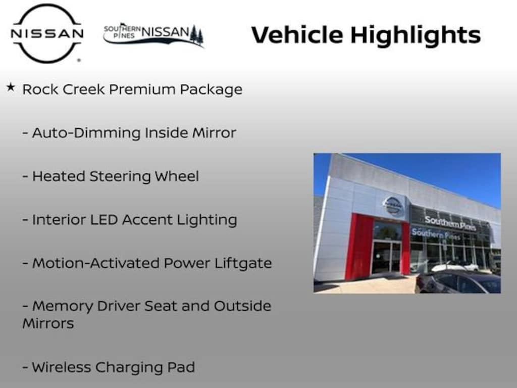AWD, 4-Way Power Passenger Seat, Apple CarPlay/Android Auto, Auto-Dimming Inside Mirror, Heated Steering Wheel, Interior LED Accent Lighting, Memory Driver Seat and Outside Mirrors, Motion-Activated Power Liftgate, Power Liftgate, Reverse Tilt-Down Outside Mirrors, Rock Creek Premium Package, Wireless Charging Pad, 18 Alloy wheels, 4-Wheel Disc Brakes, 6 Speakers, ABS brakes, Air Conditioning, AM/FM radio: Sirius, Auto High-beam Headlights, Automatic temperature control, Brake assist, Delay-off headlights, Driver door bin, Driver vanity mirror, Dual front impact airbags, Dual front side impact airbags, Electronic Stability Control, Emergency communication system: NissanConnect Services, Four wheel independent suspension, Front anti-roll bar, Front Bucket Seats, Front Center Armrest, Front dual zone A/C, Front reading lights, Fully automatic headlights, Heated door mirrors, Illuminated entry, Knee airbag, Low tire pressure warning, Occupant sensing airbag, Outside temperature display, Overhead airbag, Overhead console, Panic alarm, Passenger door bin, Passenger vanity mirror, Power door mirrors, Power driver seat, Power steering, Power windows, Premium Paint, Radio data system, Radio: AM/FM NissanConnect, Rear anti-roll bar, Rear seat center armrest, Rear side impact airbag, Rear window defroster, Rear window wiper, Remote keyless entry, Speed control, Speed-sensing steering, Speed-Sensitive Wipers, Split folding rear seat, Spoiler, Steering wheel mounted audio controls, Tachometer, Telescoping steering wheel, Tilt steering wheel, Traction control, Trip computer, Variably intermittent wipers, AWD, 4-Way Power Passenger Seat, Apple CarPlay/Android Auto, Auto-Dimming Inside Mirror, Heated Steering Wheel, Interior LED Accent Lighting, Memory Driver Seat and Outside Mirrors, Motion-Activated Power Liftgate, Power Liftgate, Reverse Tilt-Down Outside Mirrors, Rock Creek Premium Package, Wireless Charging Pad.