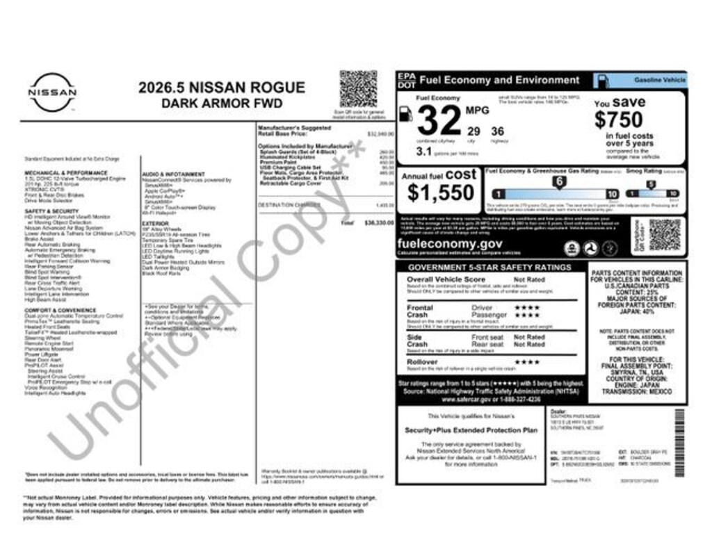 Boulder Gray Pearl 2026 Nissan Rogue SV 1.5L DOHC CVT with Xtronic FWD Price includes: $2500 - Nissan Customer Cash. Exp. 01/05/2026 $500 - Nissan MY26 Rogue and Murano Customer Cash. Exp. 01/05/2026