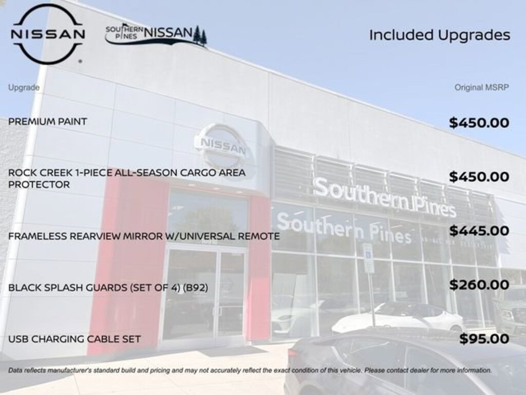 AWD, 18 Alloy wheels, 4-Wheel Disc Brakes, 6 Speakers, ABS brakes, Air Conditioning, AM/FM radio: Sirius, Apple CarPlay/Android Auto, Auto High-beam Headlights, Automatic temperature control, Black Splash Guards (set of 4), Brake assist, Delay-off headlights, Driver door bin, Driver vanity mirror, Dual front impact airbags, Dual front side impact airbags, Electronic Stability Control, Emergency communication system: NissanConnect Services, First Aid Kit, Four wheel independent suspension, Frameless Rearview Mirror with Universal Remote, Front anti-roll bar, Front Bucket Seats, Front Center Armrest, Front dual zone A/C, Front reading lights, Fully automatic headlights, Heated door mirrors, Heated Front Bucket Seats, Heated front seats, Illuminated entry, Knee airbag, Leatherette and Ballistic Nylon Seating, Low tire pressure warning, Occupant sensing airbag, Outside temperature display, Overhead airbag, Overhead console, Panic alarm, Passenger door bin, Passenger vanity mirror, Power door mirrors, Power driver seat, Power Liftgate, Power steering, Power windows, Premium Paint, Radio data system, Radio: AM/FM NissanConnect, Rear anti-roll bar, Rear seat center armrest, Rear side impact airbag, Rear window defroster, Rear window wiper, Remote keyless entry, Roof rack, Speed control, Speed-sensing steering, Speed-Sensitive Wipers, Split folding rear seat, Spoiler, Steering wheel mounted audio controls, Tachometer, Telescoping steering wheel, Tilt steering wheel, Traction control, Trip computer, USB Charging Cable Set, Variably intermittent wipers, Wheels: 17 Dark Painted Alloy, AWD.