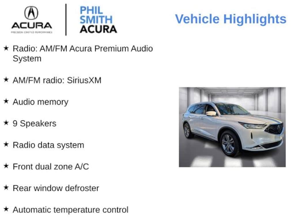 The Acura MDX's exceptional list of features and amenities ensures a premium driving experience. From the advanced infotainment system with Apple CarPlay and Android Auto integration to the sophisticated climate control and power-adjustable seating, every element has been thoughtfully designed to enhance your comfort and convenience.