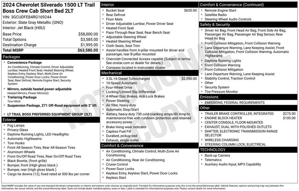 Discover the ultimate blend of power, capability, and style with this stunning 2024 Chevrolet Silverado 1500 LT Trail Boss. Boasting a powerful 3.0L I6 Turbo Diesel engine, this one-owner, garage-kept truck is ready to take on any adventure.