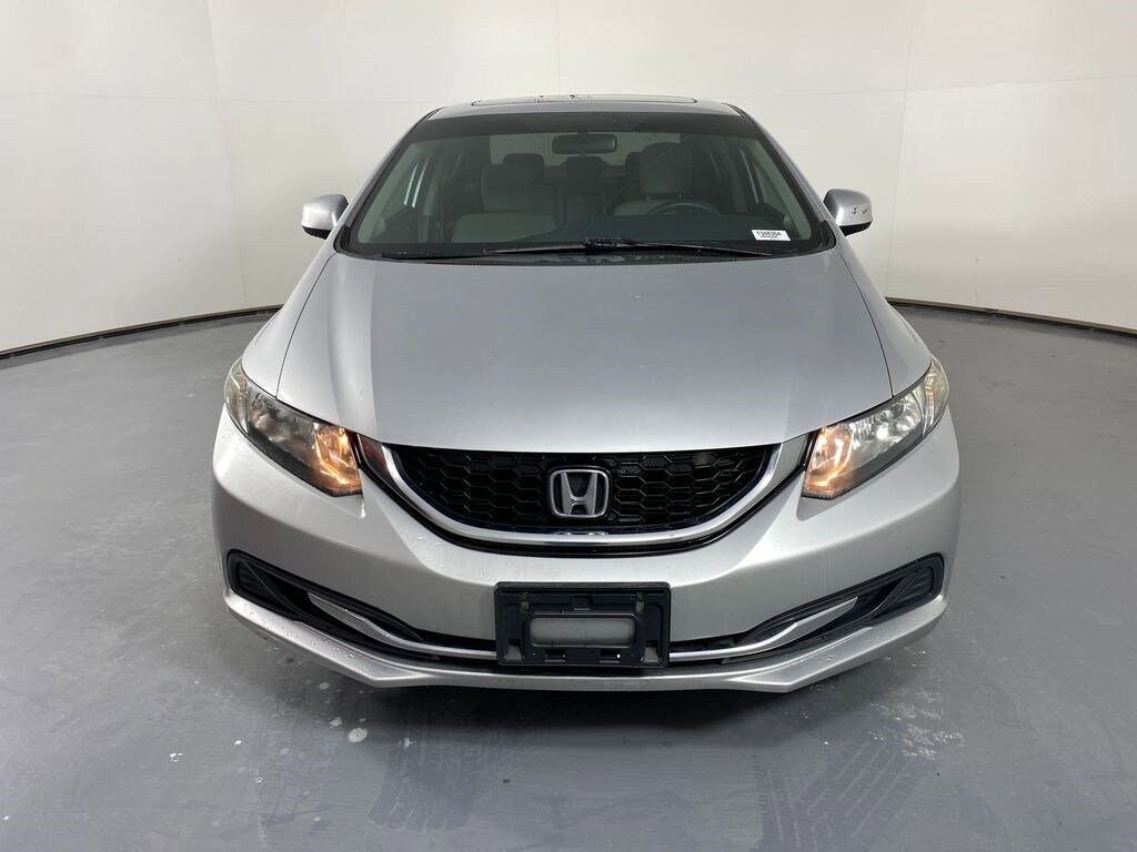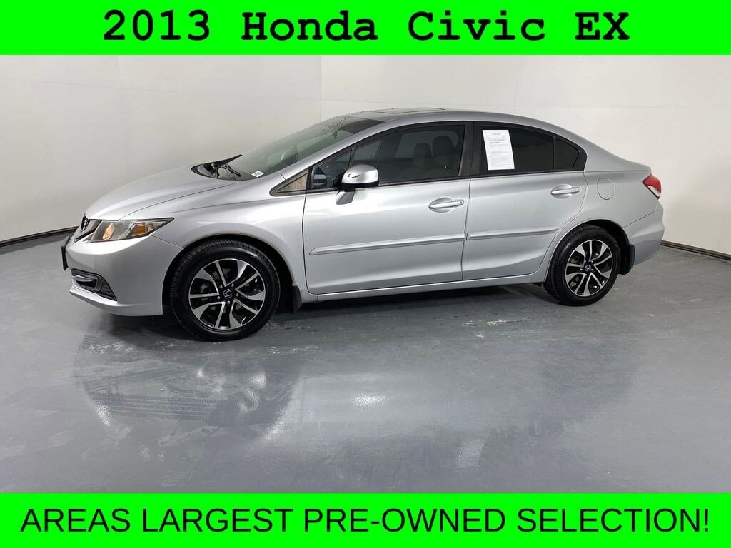 Silver 2013 Honda Civic EX FWD Compact 5-Speed Automatic 1.8L I4 SOHC 16V i-VTEC 16 Alloy Wheels, 6 Speakers, Cloth Seat Trim, Delay-off headlights, Dual front impact airbags, Electronic Stability Control, Exterior Parking Camera Rear, Illuminated entry, Low tire pressure warning system, Panoramic Moonroof, Reclining Front Bucket Seats, Remote keyless entry, Security system.