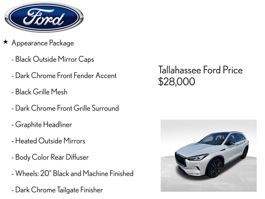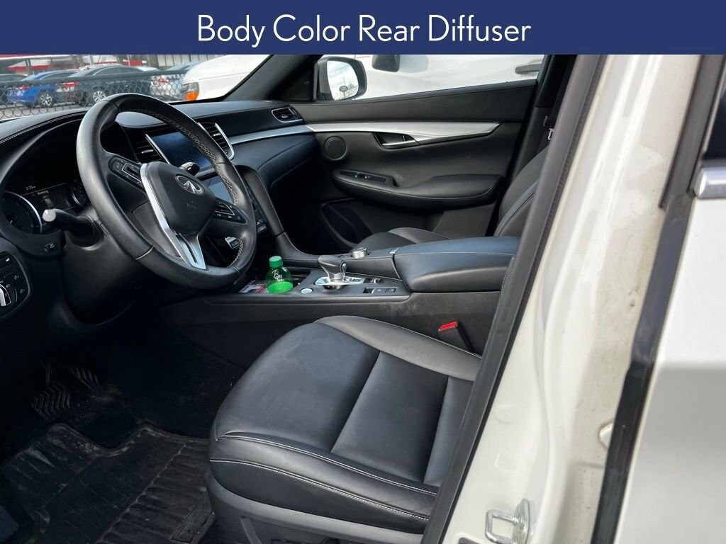 Boasting a striking exterior in a sleek White finish, the QX50 LUXE commands attention with its bold presence. Elevate your drive with the Appearance Package, featuring a Body Color Rear Diffuser, Black Grille Mesh, Black Outside Mirror Caps, and Dark Chrome accents that exude refined elegance.