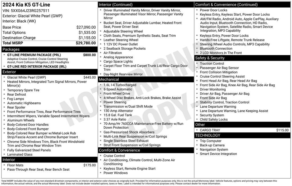 The 2024 Kia K5 GT-Line is a standout in its class, combining exceptional performance, advanced technology, and a sleek, modern design. With its turbocharged engine, smooth 8-speed automatic transmission, and front-wheel drive, this vehicle delivers an exhilarating and efficient driving experience.