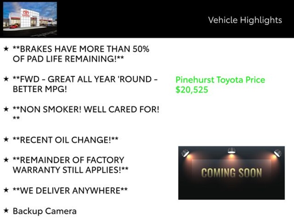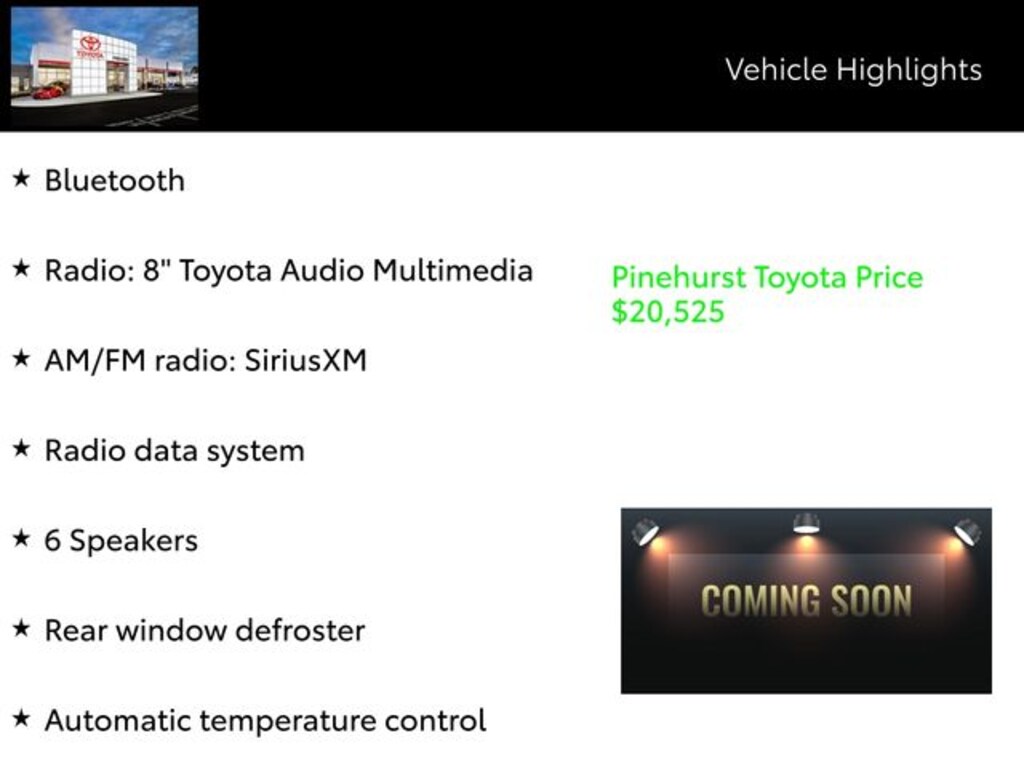 Convenience is also a hallmark of this Corolla LE, with amenities such as automatic temperature control, remote keyless entry, steering wheel-mounted audio controls, and a rear window defroster. The split-folding rear seat and front center armrest add to the vehicle's versatility, allowing you to accommodate both passengers and cargo with ease.