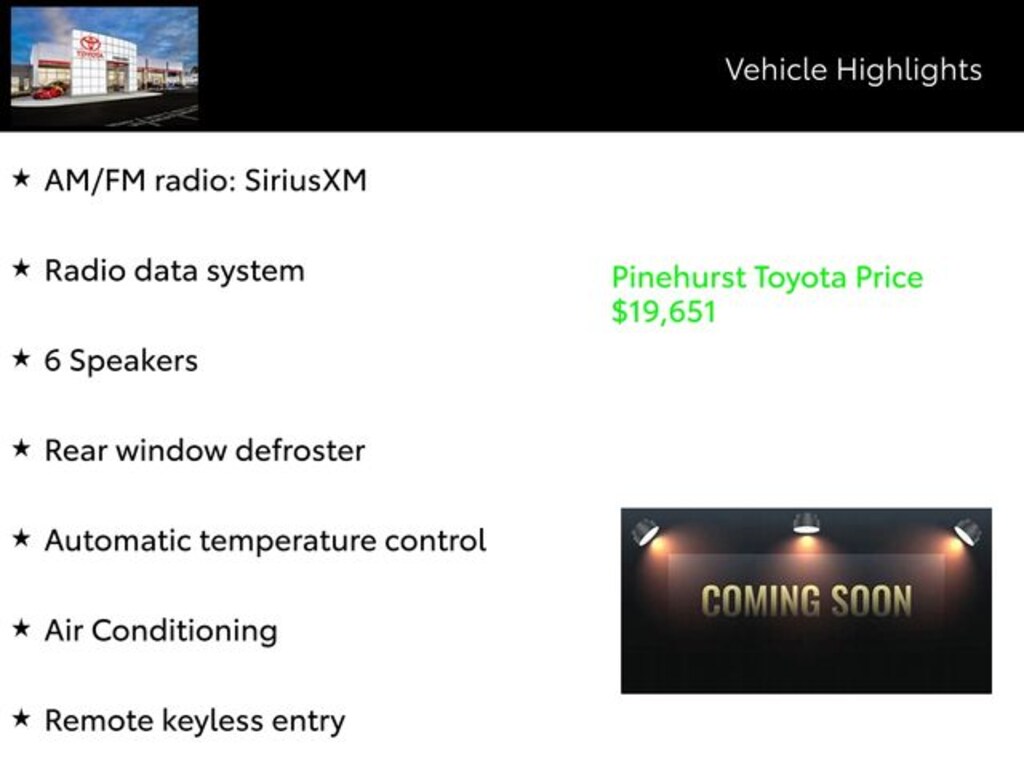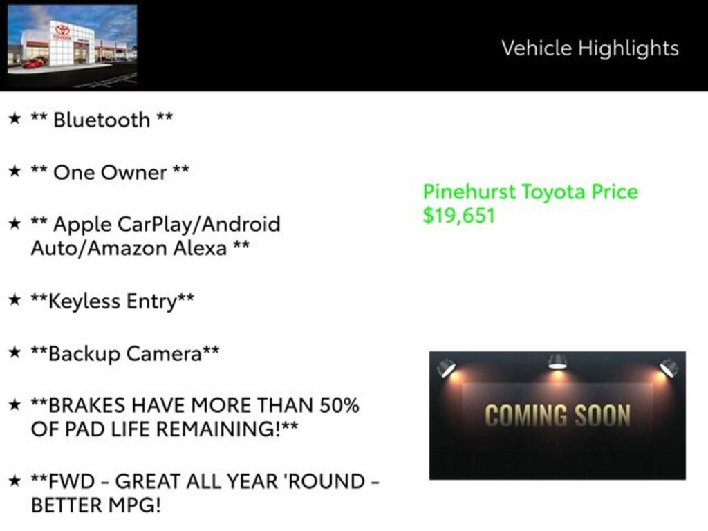 This Corolla comes equipped with a host of advanced features that will enhance your daily commute and weekend adventures. Enjoy the convenience of hands-free connectivity with Bluetooth, seamlessly integrate your smartphone with Apple CarPlay or Android Auto, and command your vehicle with the intuitive Amazon Alexa integration.